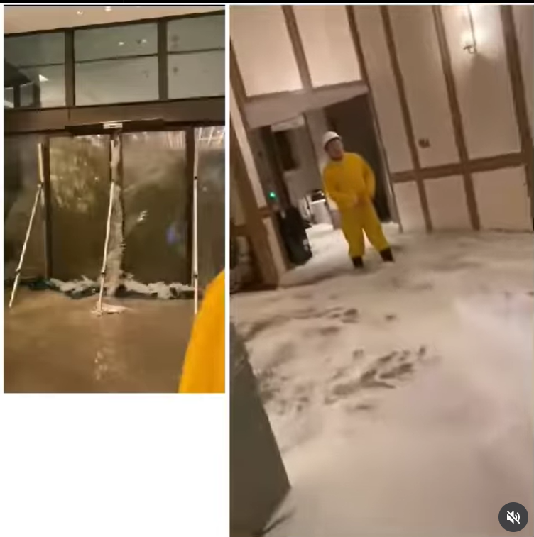 A shocking video captured the moment floodwaters smashed through the doors of a hotel in Hong Kong while Super Typhoon Regasa unleashed heavy rains and strong winds across the territory.